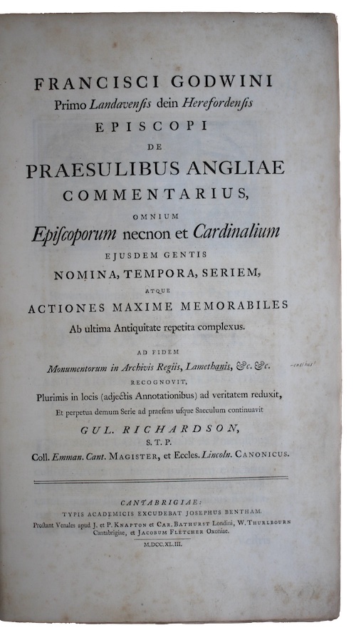 Francisci godwini Primo Landavensis dein Herefordensis episcopi de praesulibus angliae commentarius, omium Episcoporum necnon et Cardinalium ejusdem gentis nomina, tempora, seriem, atque actiones maxime memorabiles Ab ultima Antiquitate repetita complexus. Ad fidem Monumentorum in Archivis Regiis, Lamethanis, &c. &c. Recognovit, Plurimis in locis (adjectis Annotationibus) ad veritatem reduxit, Et perpetua demum Serie ad praesens usque Saeculum continuavit gul. richardson, s.t.p. Coll. Emman. Cant. Magister, et Eccles. Lincoln. Canonicus.