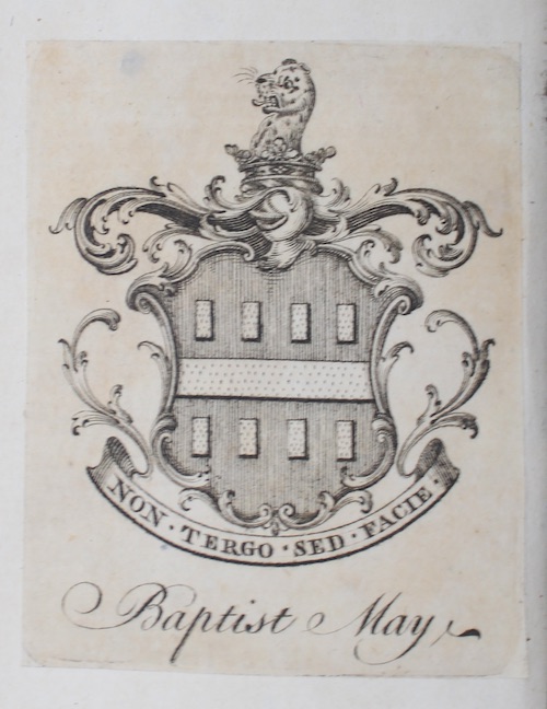Clearly emanating from the eighteenth-century, the bookplate cannot be that of the royal courtier (and favourite of Charles II) Baptist May (1628-1688). The same bookplate is found in a 1531 edition of Horace (offered by Quaritch in their 2019 Firsts London catalogue) alongside a Trinity College Cambridge morocco book label dating 1725, when a later Baptist May (whom Venn suggests was born c.1709), son of Charles May, matriculated there. Evidently a keen bibliophile, Baptist May possessed at least four more uniformly bound volumes - all lettered with the idiosyncratic 'Vol' statement on each spine, as here - from the Elzevir family presses, offered as lot