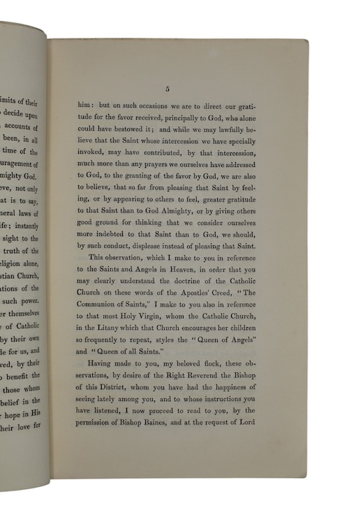 The first edition, printed at the Roman Catholic seminary of Prior Park, of a discourse intended to inspire the Catholics of Cannington with the 'miracle of the instantaneous cure' of Henry Clifford at Freiburg in 1843. Clifford, suffering from a wound which caused lameness in one foot, touched the Seamless robe of Argenteuil, one of several cloth pieces claiming to be the tunic of Christ, and was immediately healed. It would seem that the work was produced with the hope that the event would be formally considered a miracle by the Church, indeed the discourse concludes with incredulity that a Protestant gentleman present had avowed the cure as miraculous, yet the Church had as of yet not.