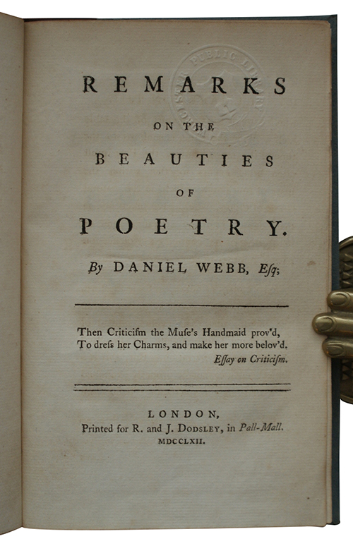 A treatise of art critic Daniel Webb (c.1719-1798) on the merits of poetry presented through the conceit of two dialogues, with particular attention paid to the imagery of Shakespeare's works. Throughout his inquiries into aesthetics Webb maintained that taste was a natural sense that recognised the beauty of moral ideas through the constraints of art.