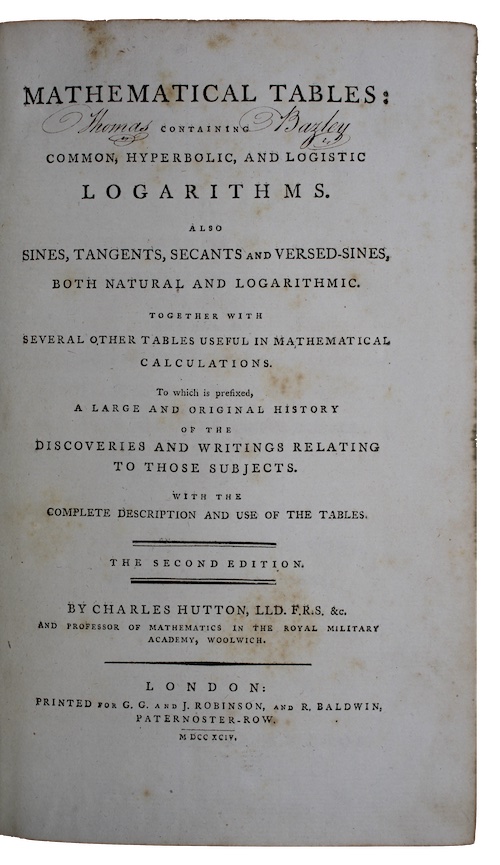 A handsome copy of English mathematician Charles Hutton's (1737-1823) logarithmic tables, first printed in 1785. The present copy belonged to Sir Thomas Bazley (1773- 1845), sometime cotton manufacturer, mathematician, and journalist; father of Victorian industrialist and politician Sir Thomas Bazley (1797-1885).