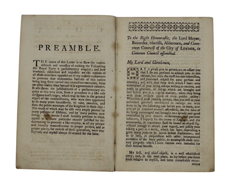 A call for an enquiry into victualling within the Royal Navy by wine-cooper and supplier to naval forces William Thompson.