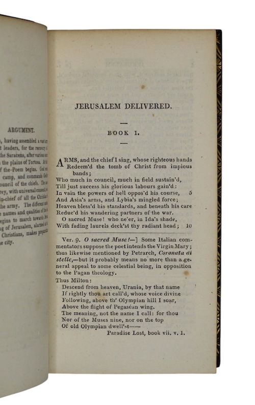 An attractively bound copy of a translation Robert Hoole's (1727-1803) translation, first printed in 1763, of Torquato Tasso's (1544-1595) epic poem of the First Crusade.