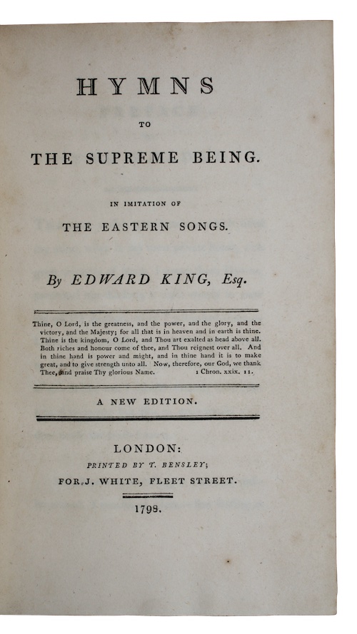The revised, second edition of antiquary Edward King's (1734/5-1807) devotional verse. First published anonymously in 1780, the King's preface to this edition makes clear his reasoning for claiming authorship: 'finding...that the work had been attributed to other;- and finding also that, in consequence of my neglect to have the Book duly entered at Stationer's Hall, advantage had been taken, to publish it by strangers; I have now thought it even a duty to come forwards. One, or more surreptitious Editions have been printed;- with several Errata;- with an unauthorised, and improper Advertisement on the back of the Title page, concerning an intended Publication, which might have been understood to have been written by me.'