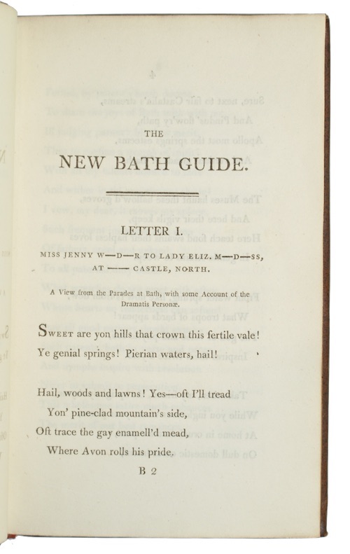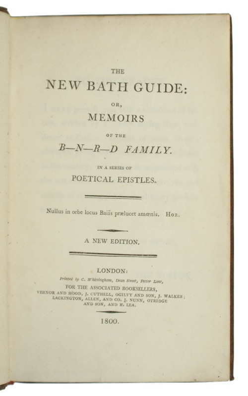 English poet Christopher Anstey's (1724-1805) popular satirical work, composed at Trumpington and first printed in 1766 at Cambridge. Horace Walpole praised the epistles, attributed to the fictional Blunderhead family, remarking that they described Bath with 'so much wit, so much humour, fun, and poetry, so much originality, [as] never met together before'.