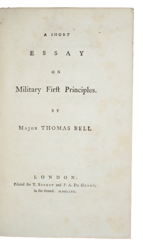 The sole edition of British Army officer Thomas Bell's (d.1782) essay on the leading principles of military operations and the conduct of war, 'addressed to the young Gentlemen who chuse the military Life', and encompassing a broad aspect of subjects from campaigning to siege warfare, the cavalry charge, and the use of musket. The Critical Review (Vol. XXIX, 1770) approved of the work; 'This essay is wrote with energy and conciseness...we heartily recommend the perusal of it to all gentlemen and the military profession.'