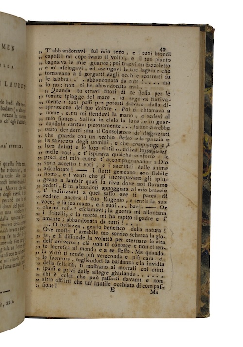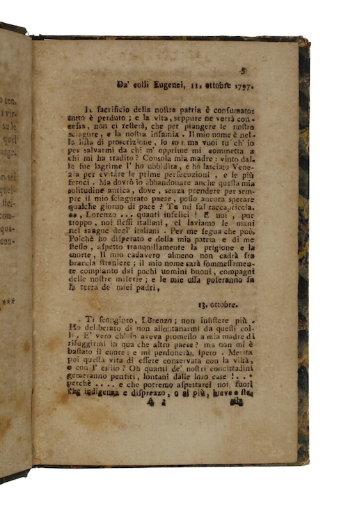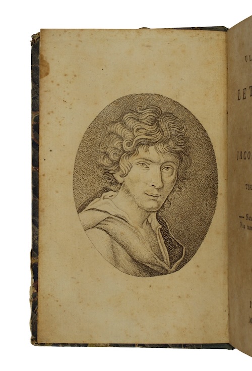 An early edition of Ugo Foscolo's (1778-1827) immensely popular epistolary novel. Initially published in 1802, the book - considered by certain critics to rank as the first modern Italian novel - is notable for its acerbic condemnation of contemporary national politics, specifically Napoleon's cessation of Venetia to Austria in the 1797 Treaty of Campo Formio.