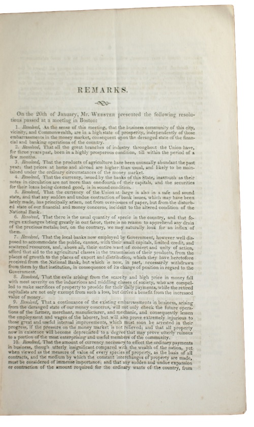 An account of the remarks made by Senator for Massachusetts, and later Secretary of State, Daniel Webster (1782-1852) during an address delivered on 20th January 1834 to the United States Senate regarding the state of banking throughout the Union.