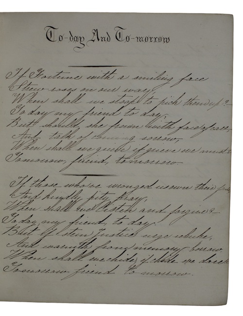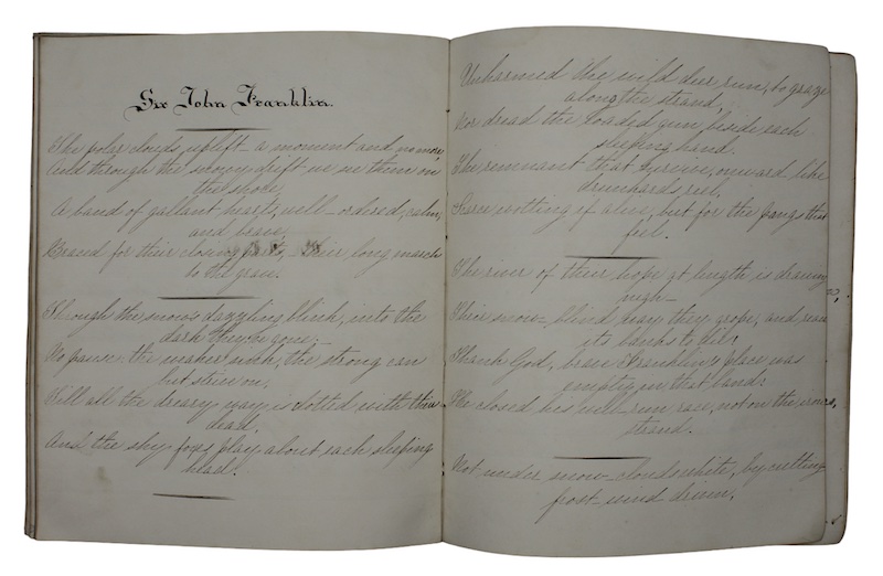 A manuscript commonplace of transcribed poetry, begun in 1863 by a Miss West, including Tennyson's 'Ode Sung at the Opening of the International Exhibition', and a six-stanza verse initially printed in Punch in 1859 on the disappearance of naval officer Sir John Franklin (1786-1847) and company during their fateful expedition to navigate the Northwest Passage.