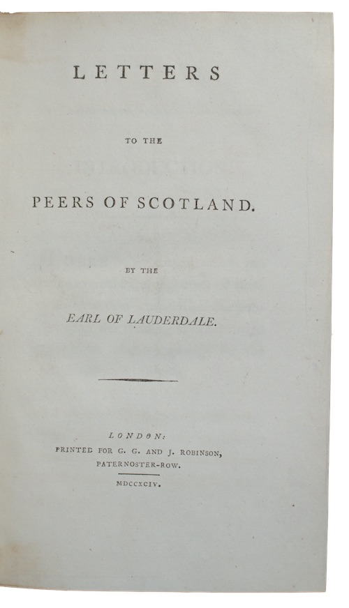 [Bound after:] LAUDERDALE, [James Maitland], Earl of. Letters to the peers of Scotland. London. Printed for G. G. and J. Robinson, 1794. First edition. [2], 318pp, [2]. Without half-title, with terminal errata leaf.