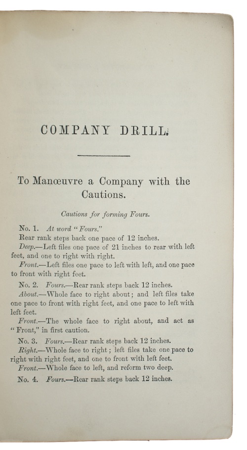 A guide to British Army infantry drill manoeuvres, first printed in 1855, compiled by officer of the Grenadier Guards Lord Henry Hugh Manvers Percy (1817-1877).