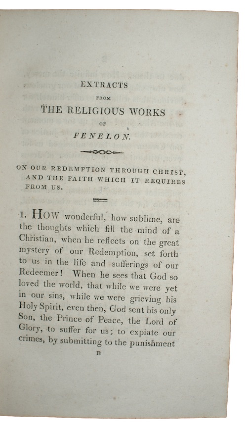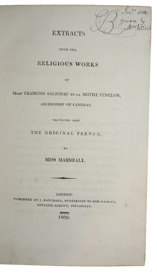 The first edition of Louisa A. Marshall's translation of select devotional and moral writings by French Roman Catholic archbishop and theologian Francois de Salignac de La Mothe-Fenelon (1651-1715). Biographical details for Marshall are frustratingly minimal; this was seemingly her only printed work besides a translation of extracts from the works of Thomas A Kempis (London, 1812).
