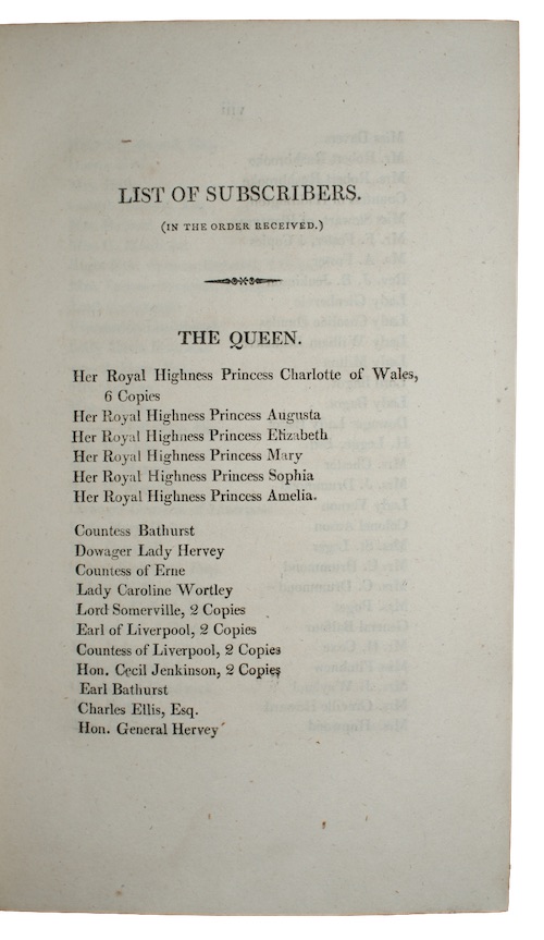xvi, 291pp, [1]. With half-title and a list of subscribers. Contemporary speckled calf, contrasting red morocco lettering-piece, gilt. Rubbed, slight splitting to joints, occasional spotting, ink gift inscription dated 1814 to head of title-page.