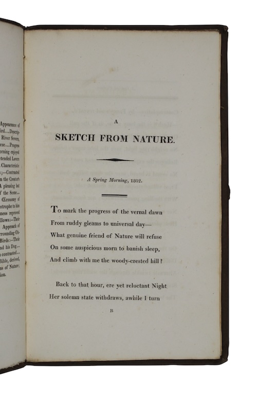 The first edition, in original state, of this anonymous pastoral poem 'attempted at an early period of life' which 'consists chiefly of a series of local scenery much endeared to the author', frustratingly however our reticent writer has omitted 'all nominal allusions to the particular spot described'. The rather juvenile verse concludes with a rather sudden diversion into an argument for the divine origin of the Bible.