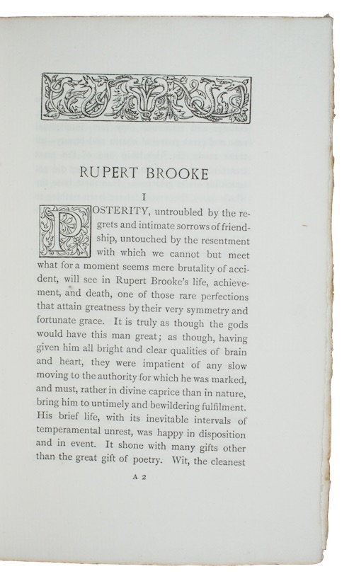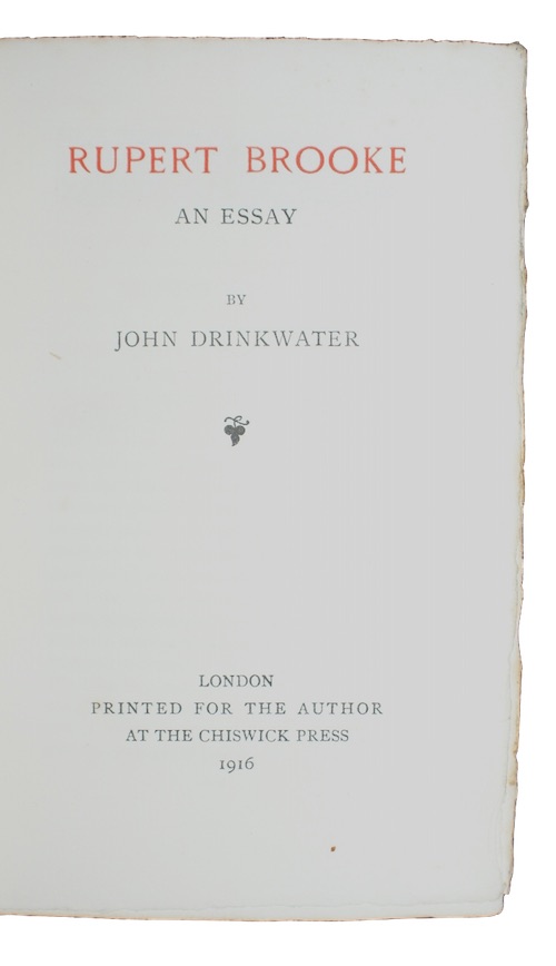 The first, limited edition of poet and playwright John Drinkwater's (1882-1937) laudatory essay on the character of his close friend and fellow Dymock poet Rupert Brooke (1887-1915).
