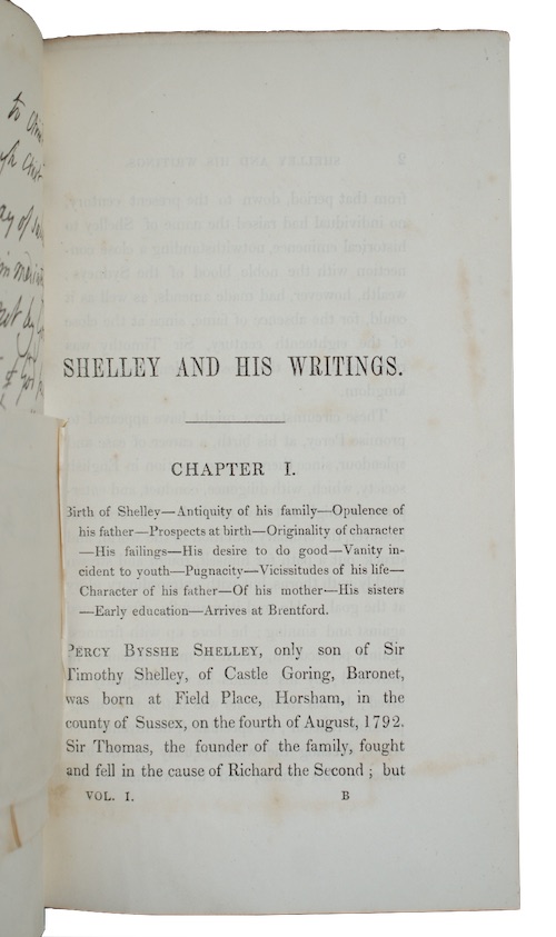 In two volumes. xv, [1], 325; x, 358pp. With a folding plate depicting a facsimile of Shelley's handwriting and a tipped-in errata slip to Vol. 1, and an 8pp publisher's advertisement catalogue to the rear of each volume. Largely unopened in original publisher's blind-stamped brown cloth, lettered in gilt. A trifle rubbed and marked, spines sunned. Later armorial bookplates of Roberti Comitis de Crewe to FEPs, lightly spotted/creased. Recently dispersed from the library of West Horsley Hall.
