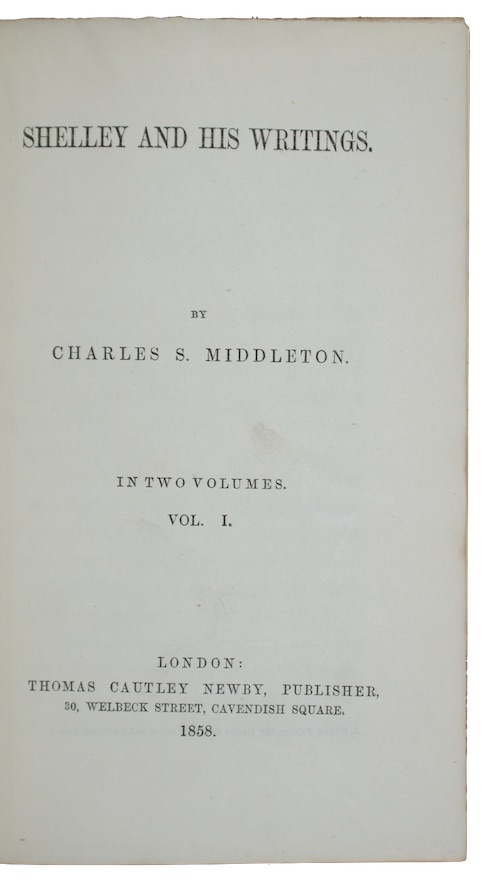 The first edition, in original state, of Charles S. Middleton's exhaustive and authoritative life of poet Percy Bysshe Shelley; compiled from, and indeed an improvement upon, earlier biographies such as Thomas Medwin's more anecdotal memoir.
