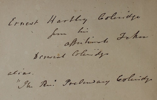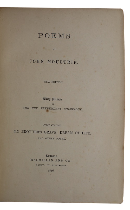 A presentation copy of the collected verse of Church of England clergyman John Moultrie (1799-1874), edited, with a memoir, by his lifelong friend Derwent Coleridge (1800-1883), second son of poet Samuel Taylor Coleridge (1772-1834).