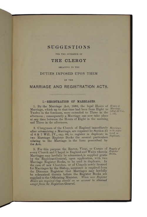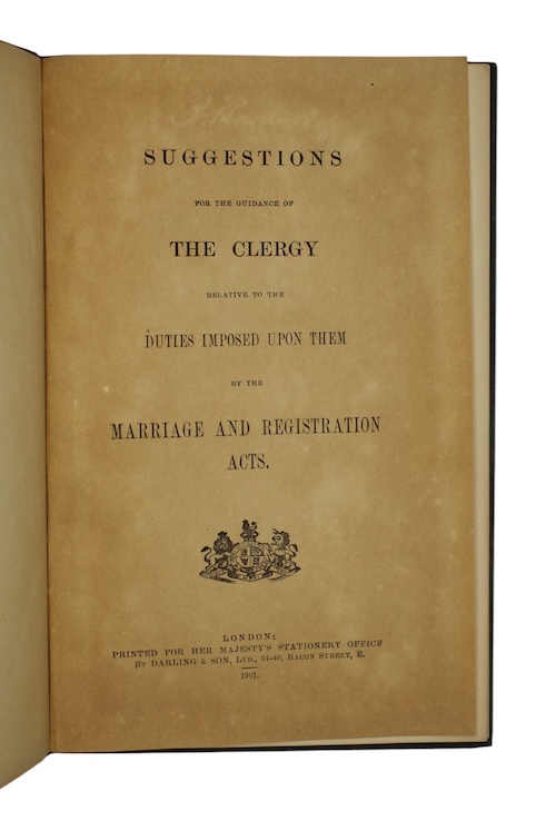 A crisp copy, in original state, of a government issued guide for the use of the Anglican clergy in the proper registration of marriages, according to the various Acts of Parliament relating to the ceremony passed during the nineteenth-century. Particular detail is devoted to the correct naming of women previously married, and later divorced or widowed. An appendix provides example certificates and instruction on how information ought to be entered and corrections to errors made.