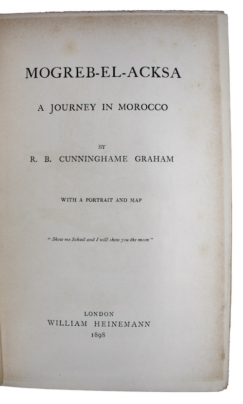 The first edition of Robert Bontine Cunninghame Graham's (1852-1936) account of his attempt, in 1897, to cross the Atlas Mountains of Morocco to Taroudant disguised as a sheikh. He was was arrested and held captive by the kaid of Kintafi for four months and ultimately turned back to Marakesh.