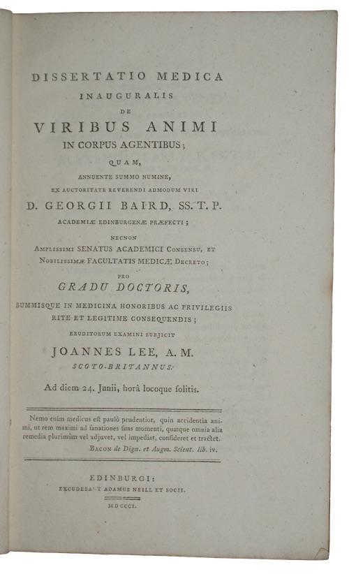 A doctoral dissertation on physiological phenomena, this copy presented to the Royal Society of Edinburgh by the author John Lee (1779-1859), a medical student at the University of Edinburgh. Lee would be elected principal of the university in 1841.