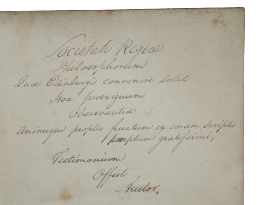 [8], 28pp. With a half-title. Original publisher's marbled paper wrappers, A.E.G. Extremities a trifle marked, loss and chipping to spine. Lightly spotted. Presentation copy, inked inscription to recto fo FFEP; 'Societati Regiae / Philosophorum / Quae Edinburgi convenire solet / Hoc perexiguum / Observantiae / Animique propter fuctum ex corum scriptis / praeceptum gratissimi / Testimonium / Offert / Auctor.'