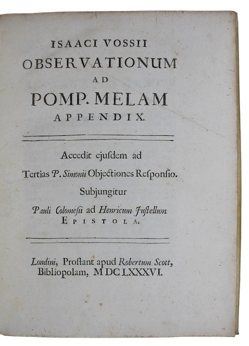 A crisp copy of the first London edition of Dutch philologist and manuscript collector Isaac Vossius' (1618-1689) supplementary volume to his commentary (The Hague, 1658) on Roman geographer Pomponius Mela's (fl. 43 CE) De situ orbis, the only ancient treatise on geography in classical Latin. The editio princeps of Mela was published at Milan in 1471; the first critical edition was by Vadianus (Basel, 1522).
