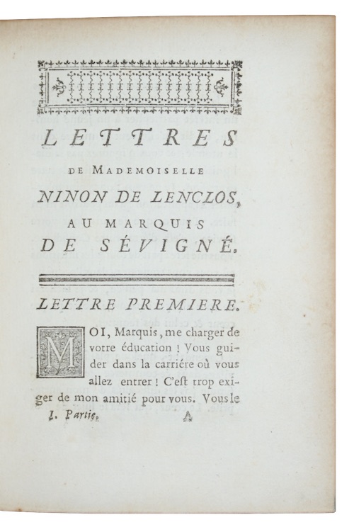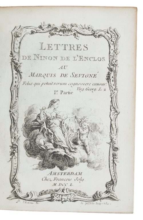 The first edition of an epistolary novel that purports to be a collection of correspondence by courtesan, salonniere, and patron of the arts, Anne 'Ninon' de Lenclos (1620-1705) to Madame de Sevigne. The work is commonly attributed to Louis Damours (1720-1788); though contemporary critics, most notably Voltaire, incorrectly assumed the author to be Claude Prosper Jolyot de Crebillon (Ninon notably provided funds in her will for a young Voltaire to purchase books). The novel proved remarkably popular and was frequently reprinted and translated into several European languages, including the English translation by Elizabeth Griffith, who assumed the letters to be genuine.