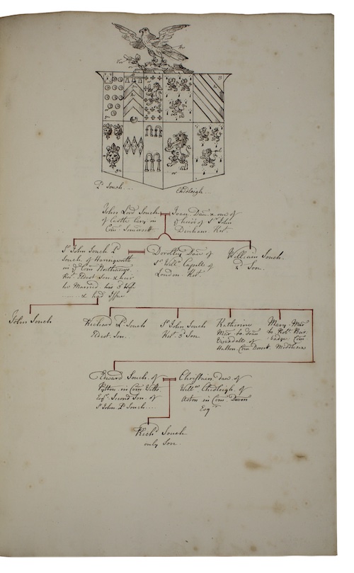 In this copy, in addition to the preliminary arms of New Sarum, the pedigrees of the Porte, Hooper, Carent, Souch, Ryley, Thacham, Le Tries, Bawer, Erington, Bellingham and Bayley are traced.