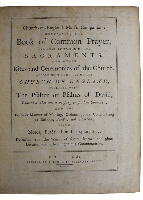 The sole Chester-printed edition of a devotional vade-mecum for Anglican clergymen issued by prolific Cheshire printer John Poole (1735?-1793). Two other, equally scarce, editions were printed at Manchester and Liverpool likely around the same time. Intriguingly, every eighth leaf is numbered sequentially up to 'No. 29', perhaps suggesting that the book was issued in parts as an affordable way acquiring a copy of the liturgy.