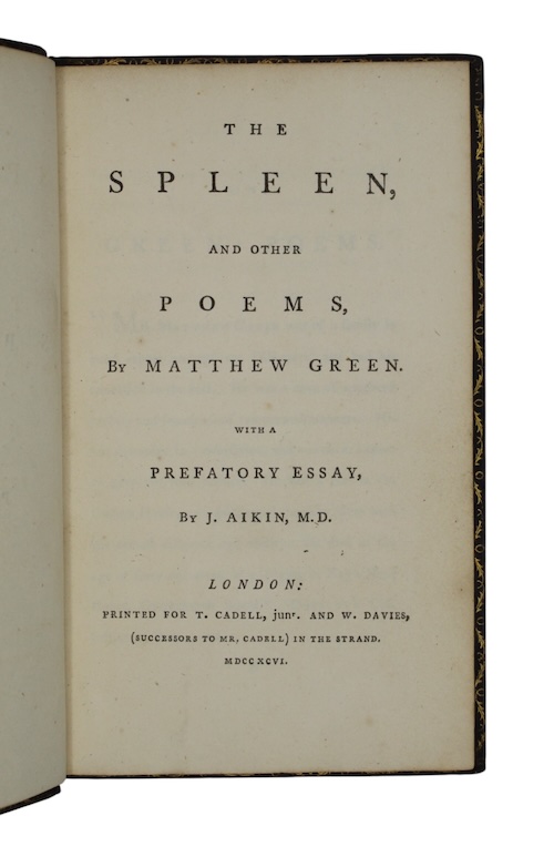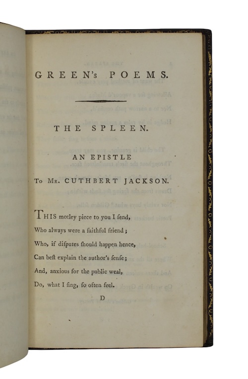 A late eighteenth-century edition of poet Matthew Green's (1696-1737) most well-known work, a light-hearted poem in octosyllabic couplets recommending the pleasures of rural life as a remedy to melancholy, first published posthumously in 1737.