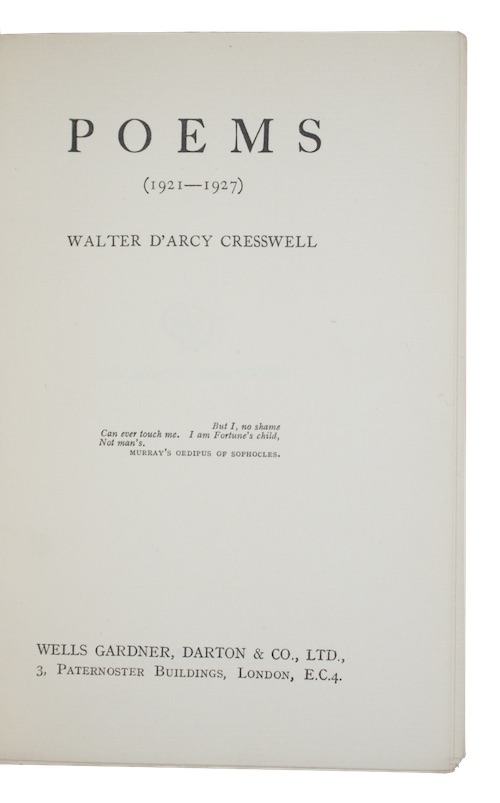 The first collection of verse from New Zealand poet Walter D'Arcy Cresswell (1896-1960).