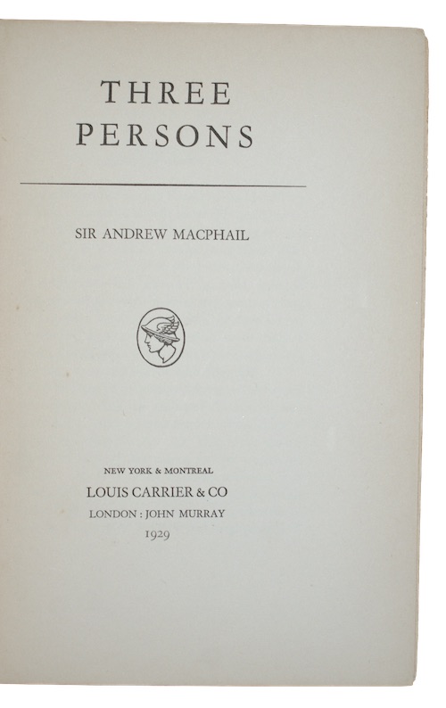 A presentation copy of the first American edition of Sir Andrew Macphail's (1864-1938) internationally acclaimed biographical sketches of Field-Marshal Sir Henry Wilson, Colonel E. M. House, and T. E. Lawrence.