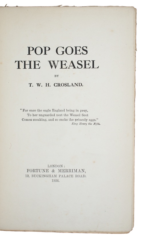 The first edition of the first book to be published under the imprint that would become the Fortune Press; a bitter condemnation of the character of the Scottish people, the final published work of Thomas William Hodgson Crosland (1865-1924).