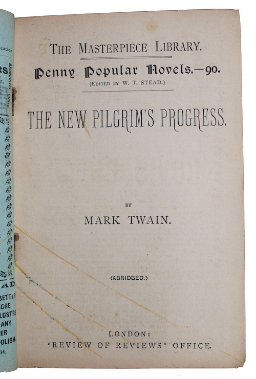 [Together with:] TWAIN, Mark. The New Pilgrim's Progress (Abridged.) London. The Masterpiece Library, "Review of Review's" Office, [s.d., c.1900]. 60pp, iv. With two final advertisement leaves.