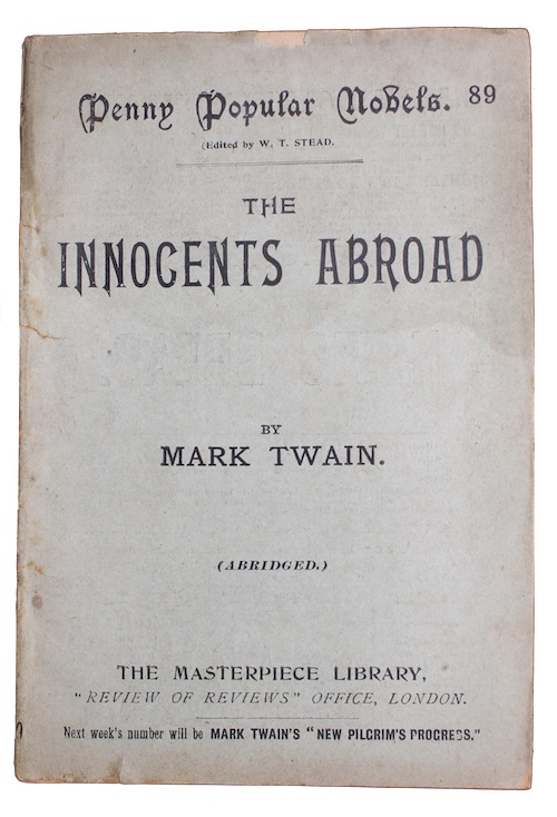 An abridged edition, in two parts, of Mark Twain's, popular humorous travelogue charting an excursion through Europe to the Holy Land, edited by journalist William Thomas Stead (1849-1912); numbers 89 and 90 in the "Review of Review's" Masterpiece Library, Penny Popular Novels series.