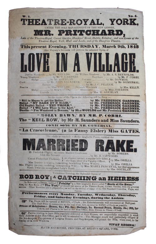 Theatre-royal, york...This present Evening, thursday, March 9th, 1843 Her Majesty's Servants will perform the admired Opera of love in a village...