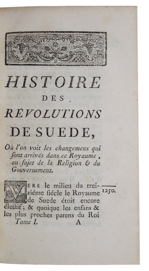 A late eighteenth-century edition of French clergyman Rene Aubert de Vertot's (1655-1735) popular history of Swedish revolutions, first printed in 1696.