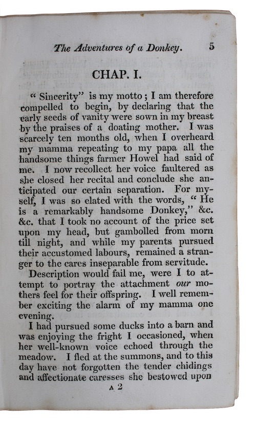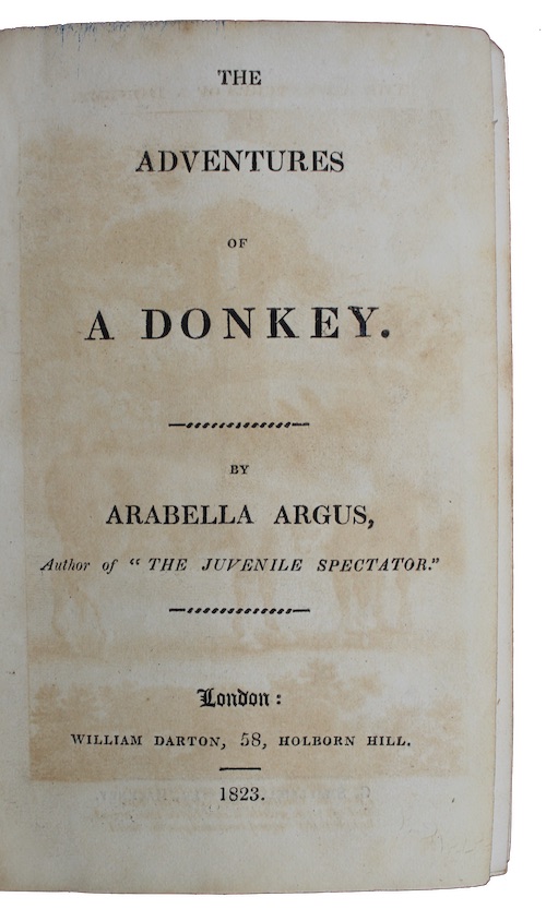 The second published work of minor children's author 'Arabella Argus', a charming narrative presented from the perspective of a donkey, passed from owner to owner, some wicked, others caring, that makes an impassioned plea for kindness towards animals. Notwithstanding the author's favourable contemporary reviews, it is surprising that her books did not sell well; the present title, first published in 1815, had to wait eight years for this second printing and was only reprinted for Darton five times up to 1860.