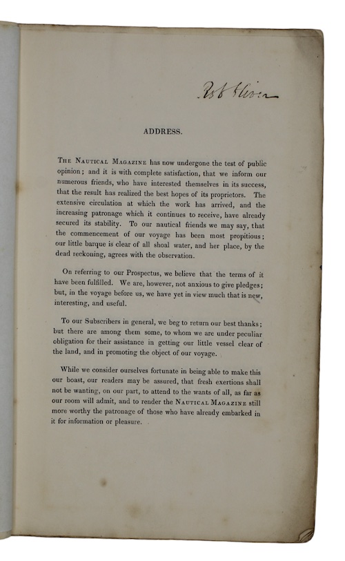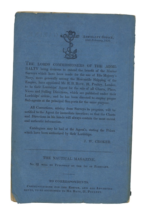 A monthly periodical, The Nautical Magazine was first published in 1832. Associated with the Hydrographic Office of the Admiralty, the magazine provided reviews of Admiralty charts and publications, articles on hazards to navigation, and reports on maritime surveys. As the century progressed, it documented the Crimean War and the First and Second Opium Wars, the construction of the Suez Canal, and ultimately futile search for Sir John Franklin's lost expedition in search of the North-West Passage.