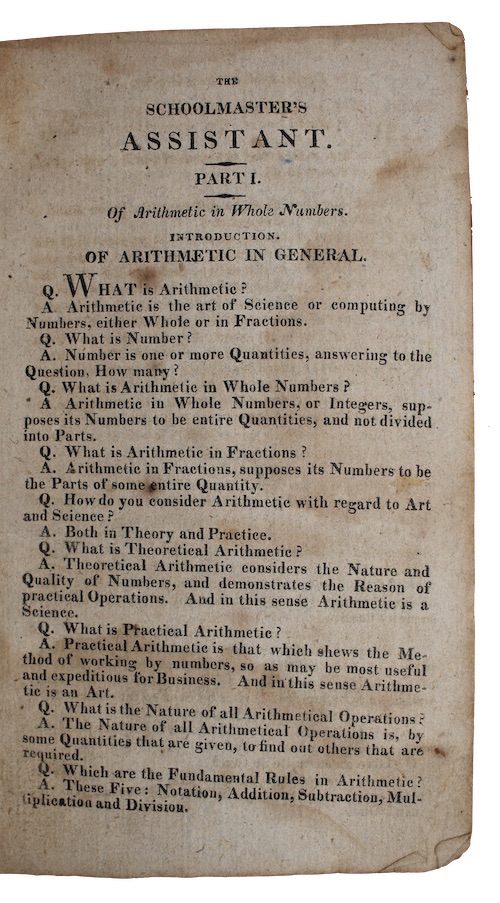 Thomas Dilworth (d.1780), Anglican clergyman and schoolmaster at Wapping. His Schoolmaster's Assistant was a guide to basic arithmetic designed for the instruction of children. As with his earlier manual of English instruction and spelling, A New Guide to the English Tongue, it secured commercial success in both the British Isles and in North America - several exercises from this present work are found in the school notebooks of Abraham Lincoln. As is often the case with these early schoolbooks, institutional holdings of the numerous individual editions are limited.