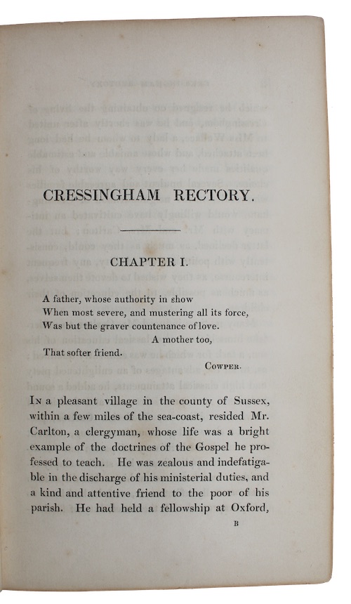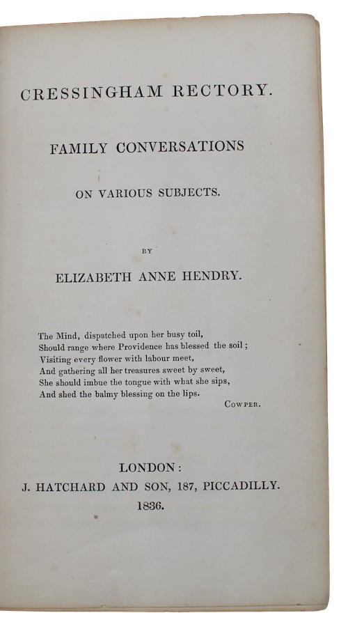 The first edition of the second and final published work of Elizabeth Anne Hendry, of whom little is known. The novel, intended primarily for a juvenile readership, and partially presented in the form of dialogues, centres upon the young family of a Sussex-based clergyman and former Oxford fellow, whose precociously curious children are educated in matters historical and spiritual, including such disparate topics as the life of Martin Luther and the events of the Battle of Trafalgar. Darton published a second edition in the same year as the first.