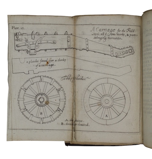 The plates, beside illustrating the science of fortification, depict various kinds of cannon and bombs, gabions, turnpikes, and a very remarkable bed for officers to sleep upon 'made of leather, wind-tite, and blown up to bear them from the damp, and unwholesome humidity of the earth'. The etchings are early examples of the technique in England, and were likely executed by one of Stone's three sons, also sculptors, who spent time abroad training in the arts.