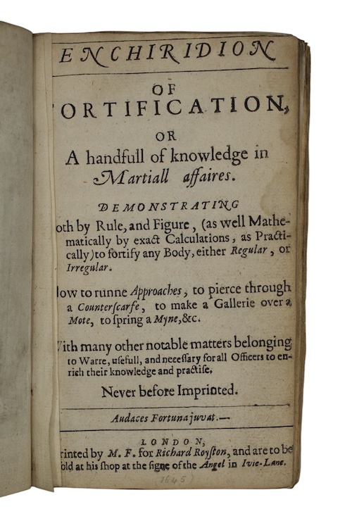 Enchiridion of fortification, or A handfull of knowledge in Martiall affaires. Demonstrating both by Rule, and Figure, (as well Mathematically) by exact Calculations, as Practically) to fortify any Body, either Regular, or Irregular...