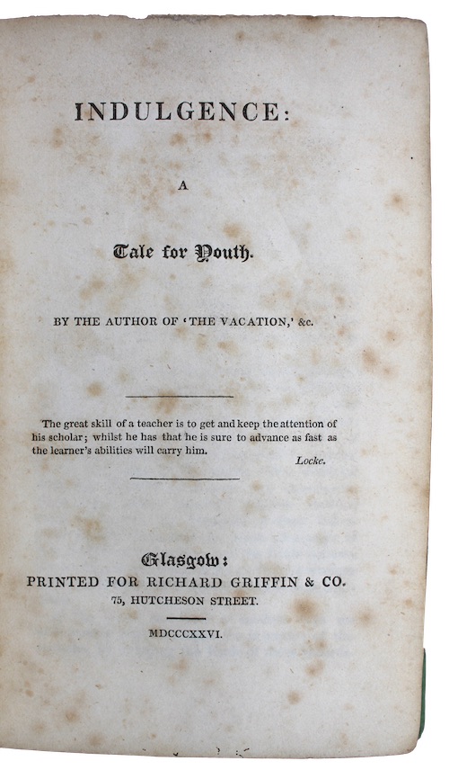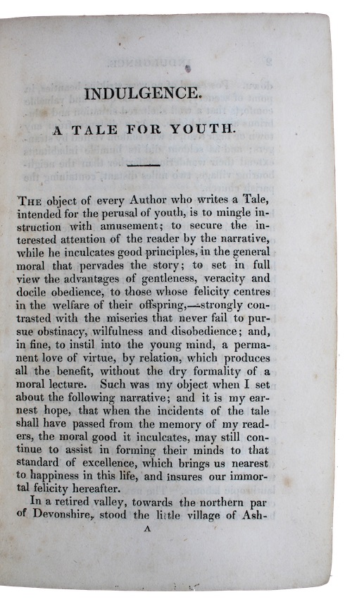 A rare survival of the sole edition of an anonymous juvenile conduct of life tale promoting Christian morality and discipline. The prose is unremarkable, and on the whole a poor imitation of contemporary publications of this type, nevertheless despite, or perhaps because of this, the publisher’s introductory remarks are effusive in their praise: ‘In the following little piece, the author has endeavoured to point out the pernicious consequences of improper indulgence; as this is the error most likely to mingle with the affection which actuates the breast of a Parent, its baneful effects cannot be too cautiously guarded against’.