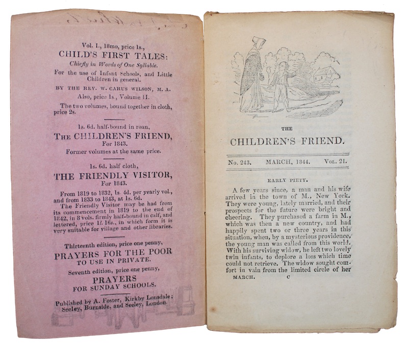 A single monthly issue, in original state, of Church of England clergyman and charity school founder William Carus Wilson’s (1792-1859) immensely popular penny periodical The Children's Friend. Begun in 1824, the series appeared concurrently with Wilson’s the Friendly Visitor (established 1819), and the Teacher’s Friend (1844), all of which attained a wide circulation and influence, with upwards of 3,000 copies distributed monthly by 1845.