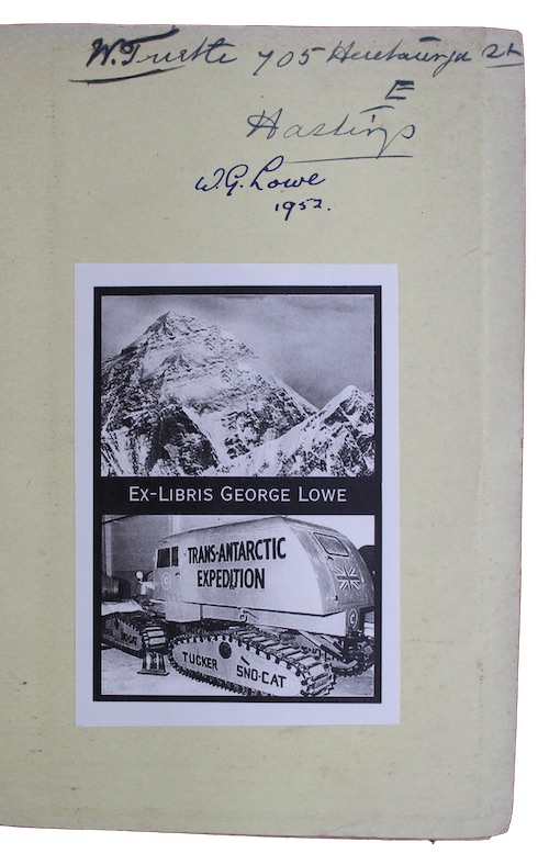 From the library of New Zealand-born mountaineer George Lowe (1924-2013), a member of the 1953 British Mount Everest expedition, the ninth mountaineering expedition to attempt the first ascent of Everest, and the first confirmed to have succeeded when Tenzing Norgay and Edmund Hillary reached the summit on 29th May. The day prior, Lowe had led an advance guard, wielding an ice axe with legendary skill, to cut a path into the Lhotse Face to the final camp (1,000 feet below the peak), preparing the route for Hillary and Tenzing Norgay. Following this achievement Lowe became a New Zealand representative on the Commonwealth Trans-Antarctic Expedition which, between 1955 and 1958, not only traversed Antarctica, becoming the first to reach the South Pole by land since Amundsen in 1911 and Scott in 1912, but also carried out extensive surveying of the continent.