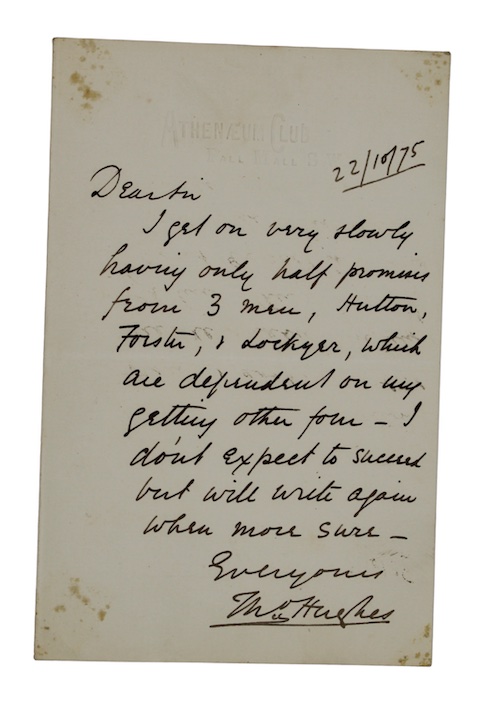 Thomas Hughes' (1822-1896) immensely popular public school farce, first published in 1857, with a loosely inserted A.L.S. from the author, on Athenaeum Club stationery, dated 22nd October 1875: 'Dear Sir, I get on very slowly having only halfpromises from 3 men, Hutton, Forster, & Lockyer, which are dependent on my getting other four - I don't expect to succeed but will write again when more sure - ever yours Thos. Hughes'.