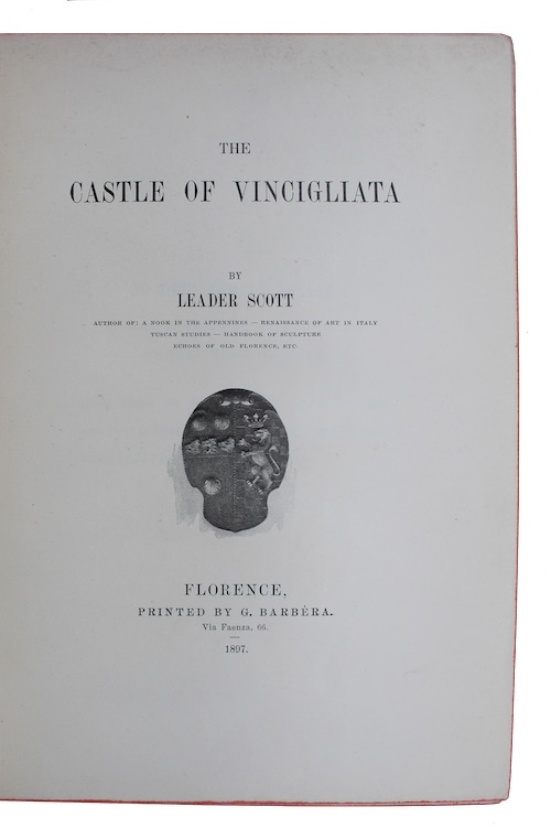 Lucy Baxter (1837-1902) a writer on art, whose publications appeared under the pseudonym of Leader Scott - a combination of the maiden names of her grandmothers. Her works consist primarily of popularisations of scholarly research on Florentine art and artists. The present work provides and account of the history and restoration of the Castello di Vincigliata, Florence.