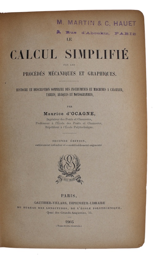 Le calcul simplifie is one of the earliest attempts to classify calculating machines by type, divided into mechanical, logarithmic and graphical. Ocagne's survey includes 'several one off-machines...such as the automatic multiplying machine of Leon Bollee (which used a mechanical form of Napier's bones) and the machine designed by Chebyshev' (Tomash and Williams II, p. 949).